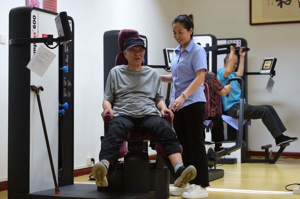 A care worker assists a resident with his workout routine at a care center in Cangzhou, Hebei province, June 9, 2023. VCG
